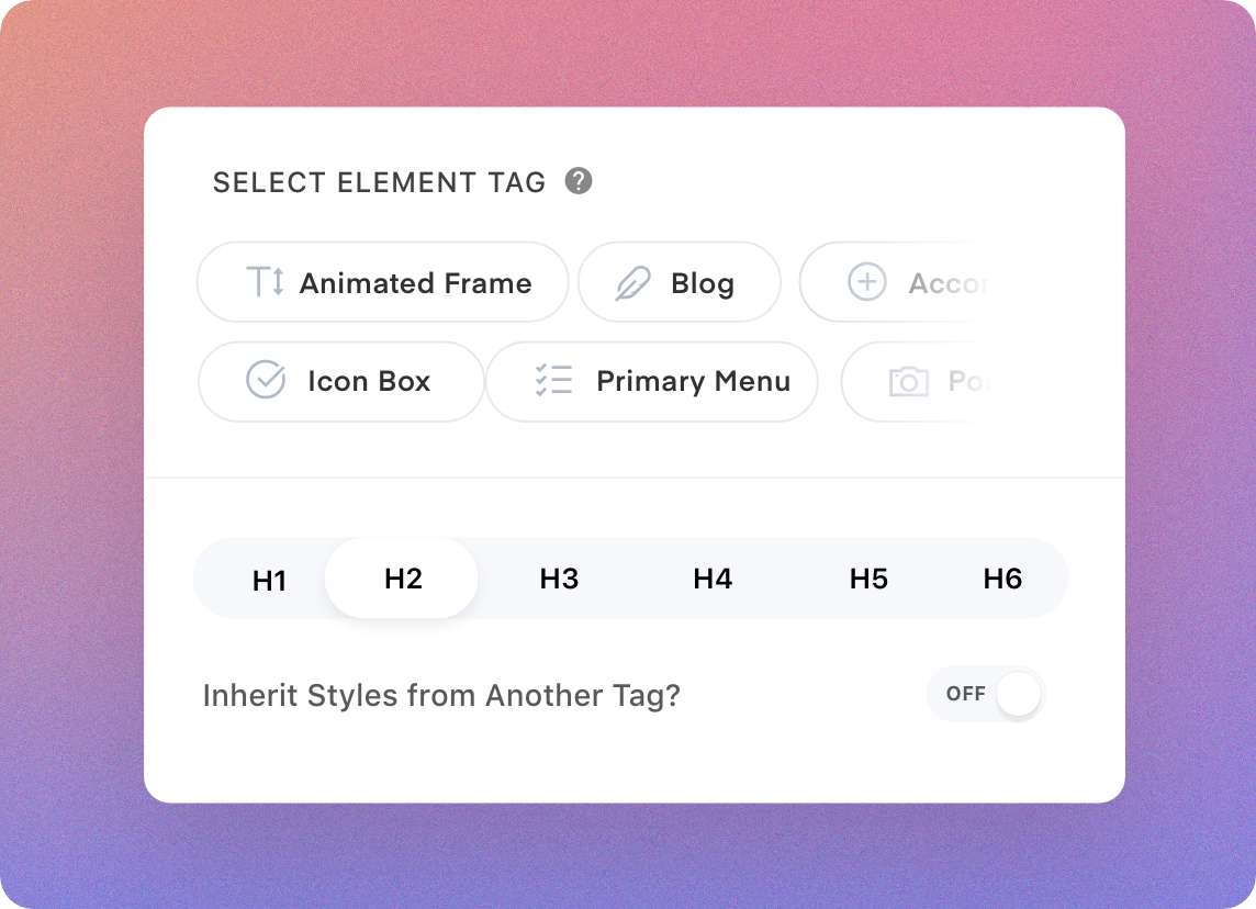 Heading Tags provide structure and hierarchy for your content as they improve the readability of your site. Now, you can assign custom heading tags to all widgets including portfolio, icon box, blog and more. You can even inherit CSS styles from other headings without changing the HTML tags.